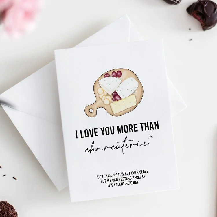2. There are some foods that are universally loved by everyone, and cheese is definitely one of them! This “I Love You More Than Charcuterie” card plays off of that and also pairs perfectly with a bottle of wine.t stand out