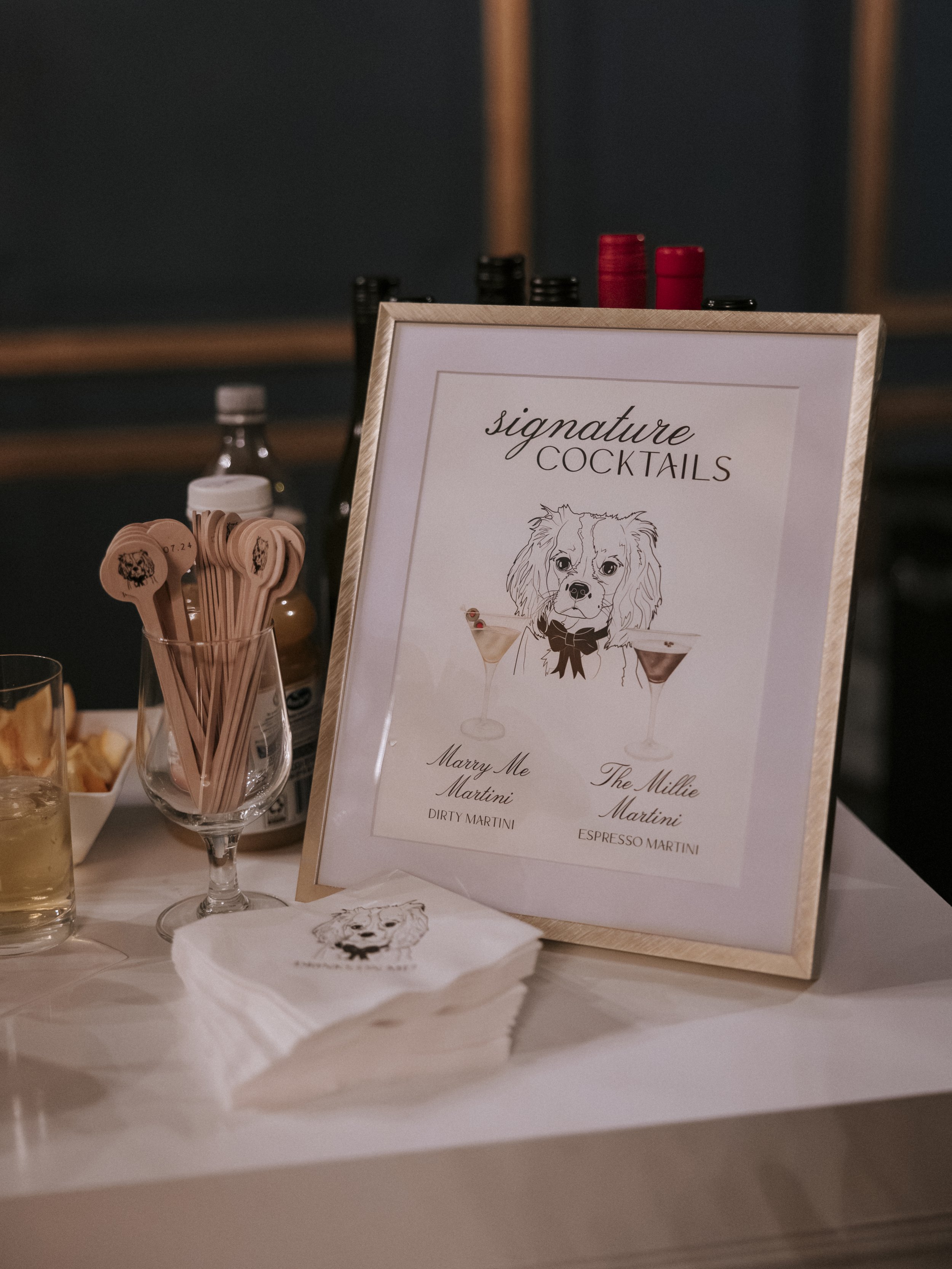 Some of the most popular and requested items are signature drink signs as they really add the perfect signature touch to your wedding! These signs really spice up your bar and get your guests excited to fill up their glasses, plus they look great on your bar cart at home after the wedding. You can even get some fun cocktail napkins to match! Watercolor drink signs start at $75 and look great in either an 8x10” frame or on an easel. Of course adding your pets is always an option as well with prices starting at $300. Does your wedding have a more modern feel? We can also create acrylic, engraved leather, and fabric signage. Cocktail napkins are also a great addition and any napkins that are leftover at the end of the night can be used at your next house party so nothing goes to waste! Foil and watercolor napkins start at 80 cents each and are full customizable from the artwork on them to the color. You can select fun facts, your monogram, your pets, your venue, and so much more for your napkins. Who wouldn’t love that?!